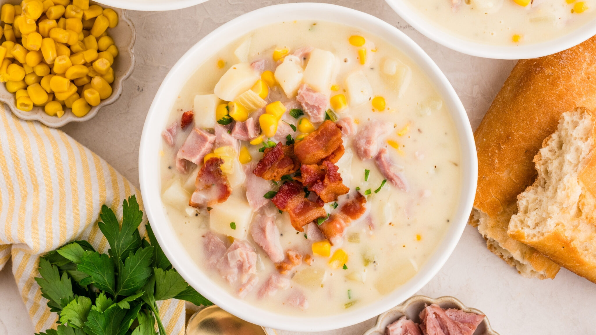 This one-pot chowder takes just under 1 hour from start to finish and makes use of what’s already in the fridge. Bacon kicks things off, followed by a quick sauté of onion and celery, then it all simmers together with ham, corn, diced potatoes, broth, milk, and cream. The thyme and oregano give it enough flavor to hold its own, and it comes out creamy without being heavy. You can use frozen or canned corn, swap in red potatoes, or toss in extra vegetables if you have extra. Serve with garlic bread or something crunchy on top.