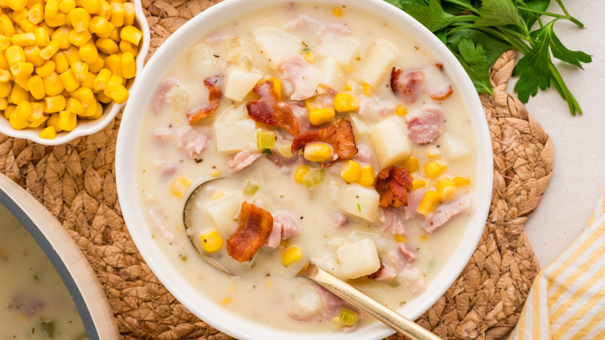 Bacon, ham, potatoes, and corn all share the same pot in a chowder that finds the middle ground between soup and dinner. Everything cooks together in about 50 minutes, thickened just enough by cream and flour to feel hearty without turning dense. The sweetness of the corn balances the salt from the ham, while a little pepper and thyme keep it grounded. It reheats smoothly, so you can make it ahead without worrying about texture. The bacon stirred in at the end gives it a smoky edge that makes a second bowl hard to avoid. A handful of parsley on top is optional, but bread on the side isn’t — it’s practically required.