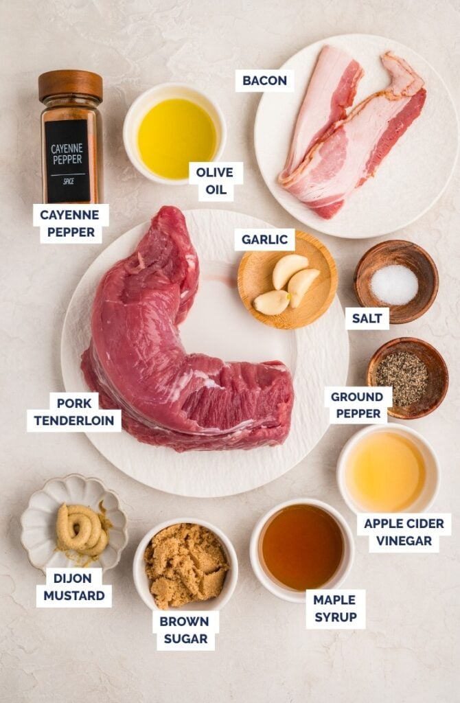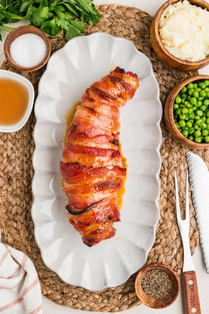 Pork tenderloin is lean and naturally tender, but it can dry out if it cooks too long. The bacon adds enough fat to help keep it moist while it roasts, and the glaze gives you that sweet-salty finish without needing a bunch of extra ingredients.