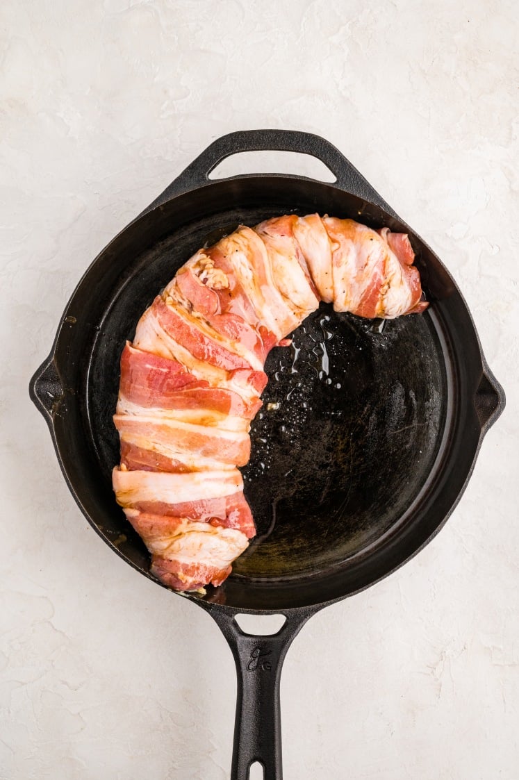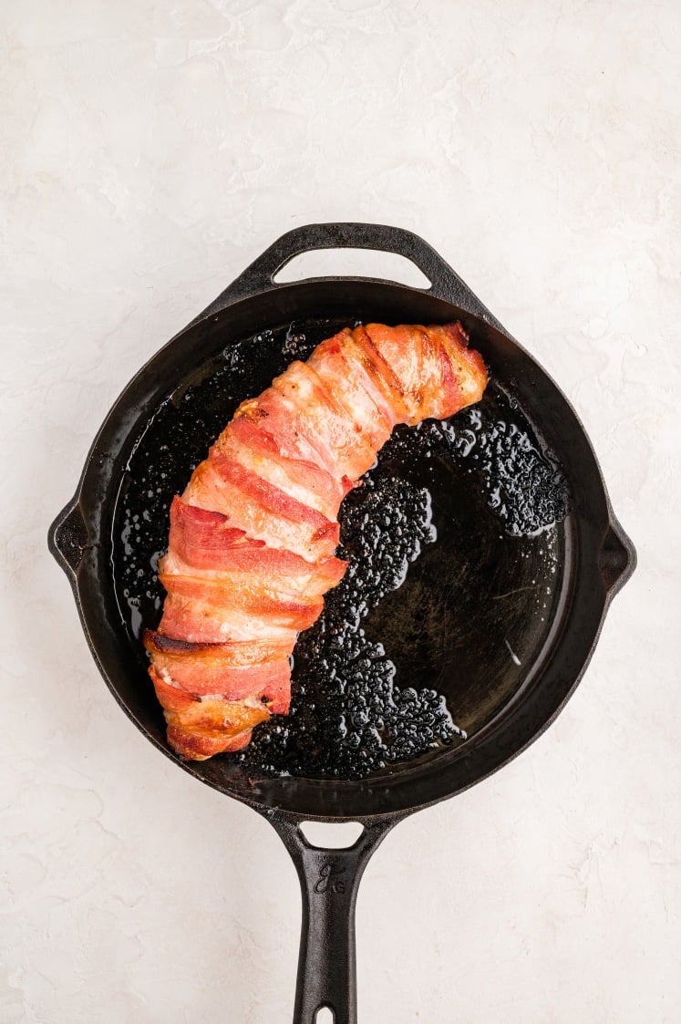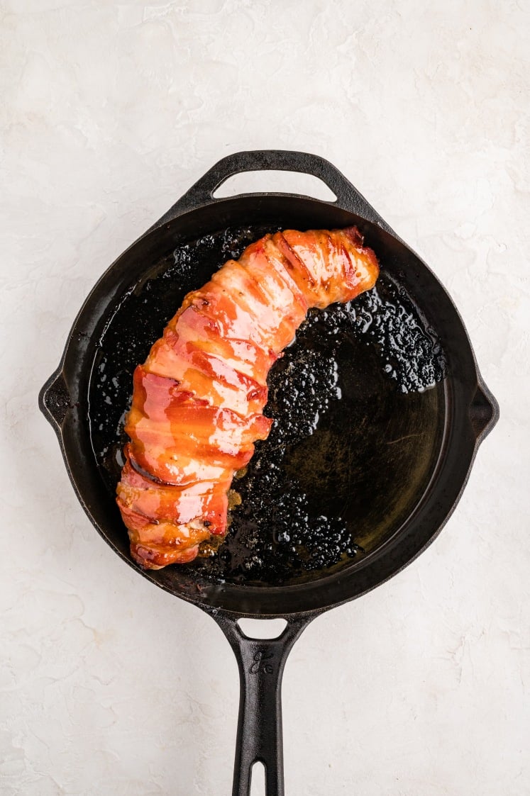 - Wrap in Bacon: Wrap the bacon slices around the tenderloin, overlapping slightly and keeping them snug so they don’t slide off. Set it seam-side down in a cast iron skillet or baking dish. If needed, secure the bacon with toothpicks (remove before serving). Brush half the glaze over the bacon.