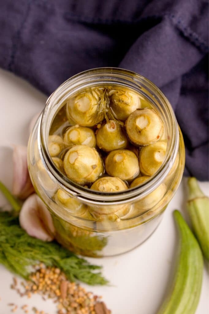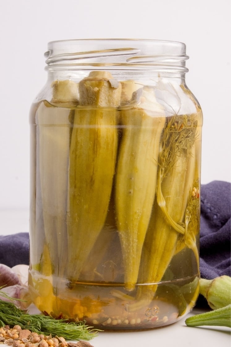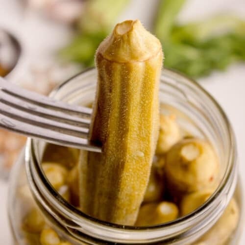 This Pickled Okra recipe uses one pint jar, fresh okra pods, and a short list of pantry staples — white vinegar, garlic, dill, and a pickling spice blend — with no canning equipment or special technique involved. You make the brine on the stove in a few minutes, pour it over the packed okra, and let the fridge do the rest. Prep takes about 20 minutes, and after at least 3 days in the fridge, you've got a jar of crisp, tangy pickled okra that keeps for weeks — and once you see how easy it is, you'll want to keep a jar going all the time.